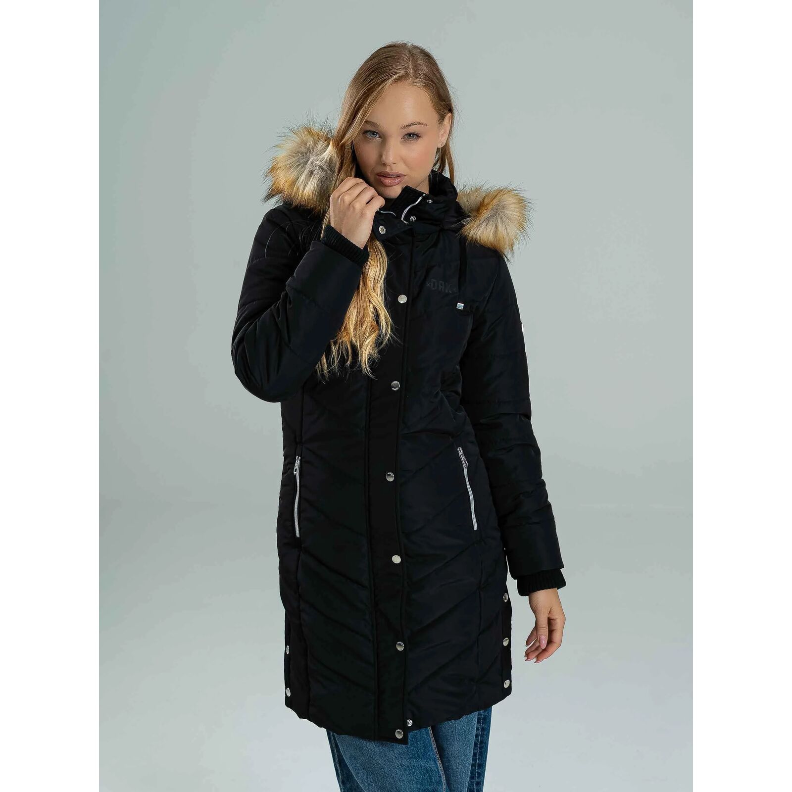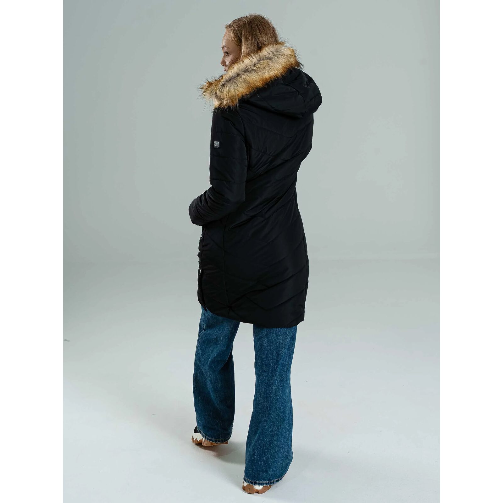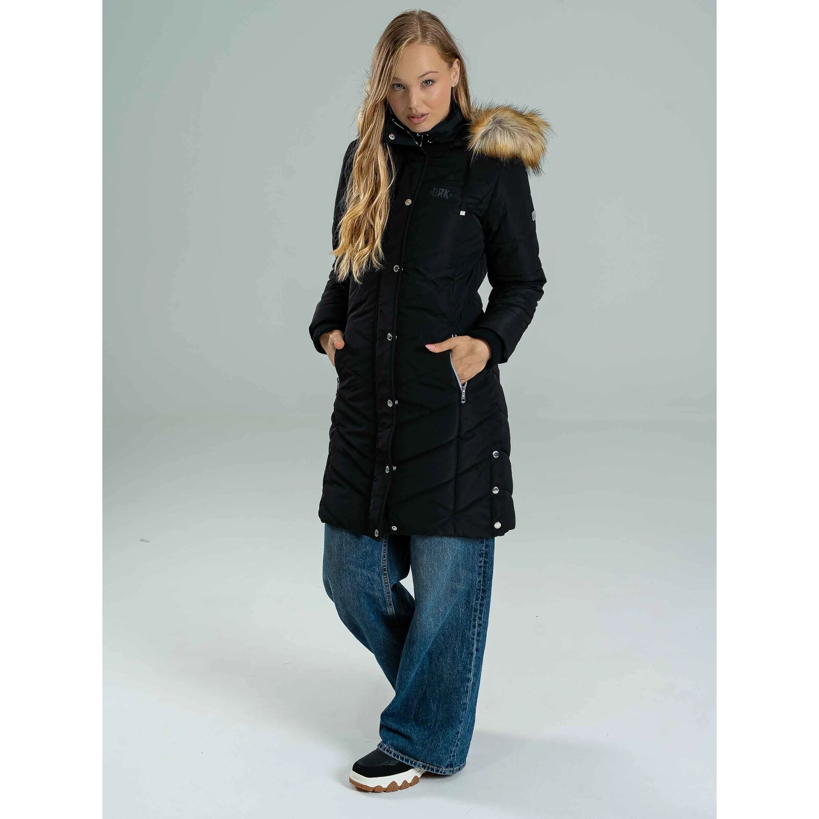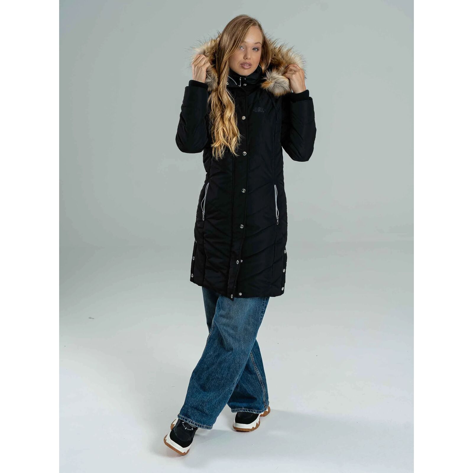 A NENA egy karcsúsított szabású, meleg télikabát, amely tökéletes választás a hideg hónapokra. 100% poliészter anyagból készült, így könnyû, mégis kiválóan szigetel. A fényes guminyomatos logó, a bal felkaron található fémnyomat logó, valamint a logózott gombok és cipzár modern, prémium megjelenést biztosítanak. A levehetõ szõrmés kapucni variálhatóvá teszi a kabátot, míg a kötött passzé fokozza a komfortérzetet és extra védelmet nyújt a hideg ellen. A modell 174 cm magas és S-es méretet visel.