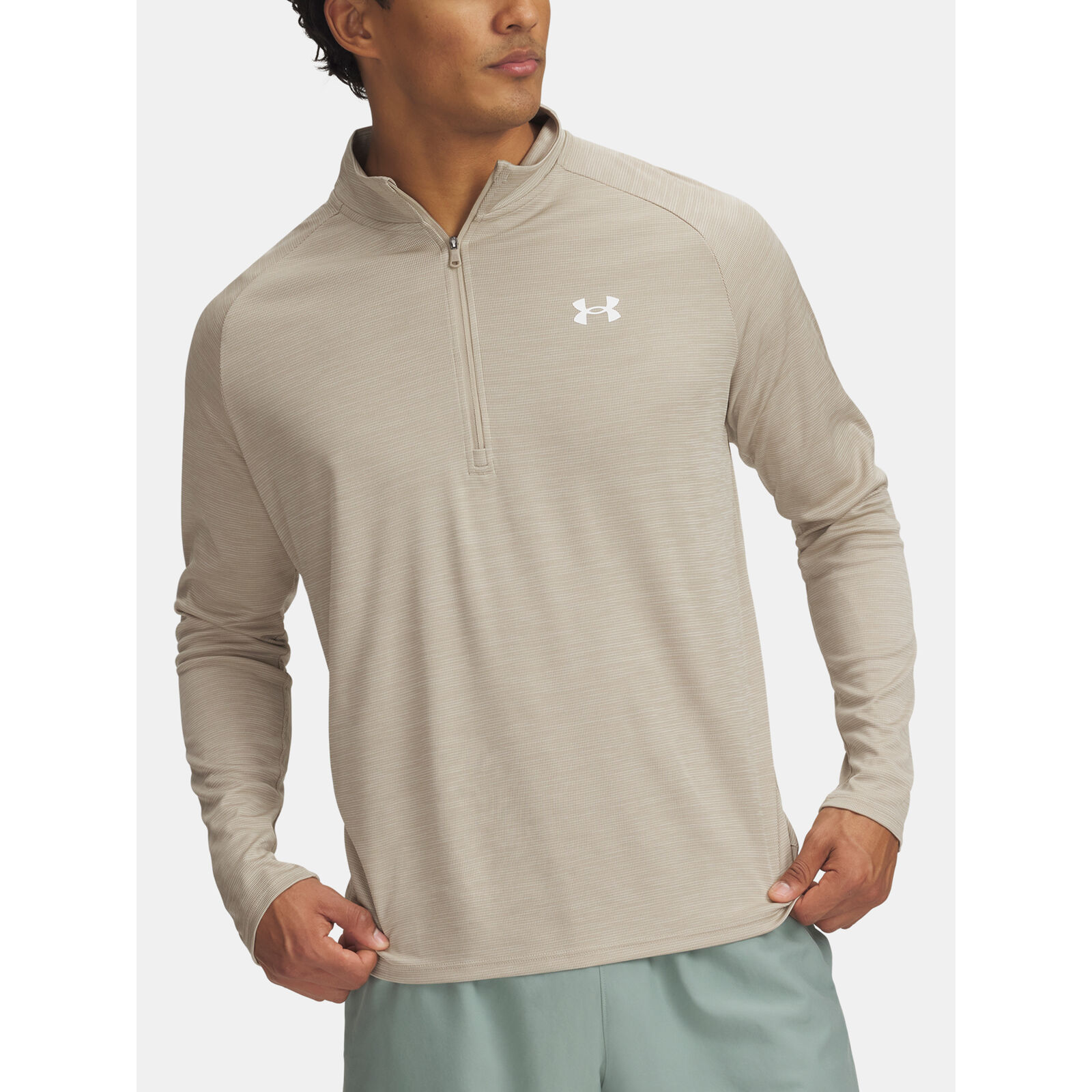 Az UA Tech szövet gyorsan szárad, nagyon puha és természetesebb érzést nyújt viselés közben.Az anyag elvezeti az izzadságot és nagyon gyorsan szárad.Praktikus elülsõ ½ cipzár a könnyebb fel- és levételhez.